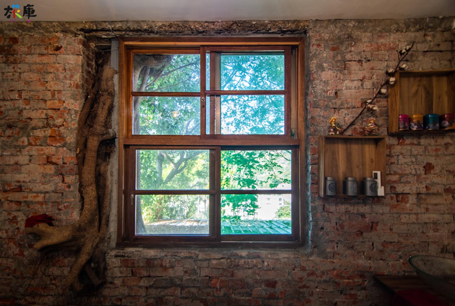 空間的運用上,區隔出不同的情境與使用狀態,入口吧台前是茶具展示的空間,牆面上掛著茶的烘焙分類知識以及各種品香的小茶罐,一樓的另一個空間則是可供多人聚會的空間,側間二樓有具隱密性的包廂,主建築二樓空間則是保存原住戶回憶的舊照片以及紀錄整修過程的照片,二樓的另一間則是作為她對於熱愛服飾的網拍商品空間。主屋的大樹盤根,紀錄著時間與老屋之間的牽絆。