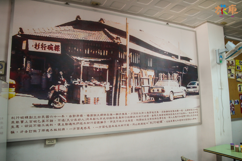 原本只是沿街叫賣的碗粿,因為一家木材行老闆發現他們用料實在與用心經營,免費提供店門口的位置讓他們賣,後來終於有了自己的店面之後,就將木材行(杉為木材的名字)用在自己的店名而成了今天的 彰化美食「杉行碗粿」。