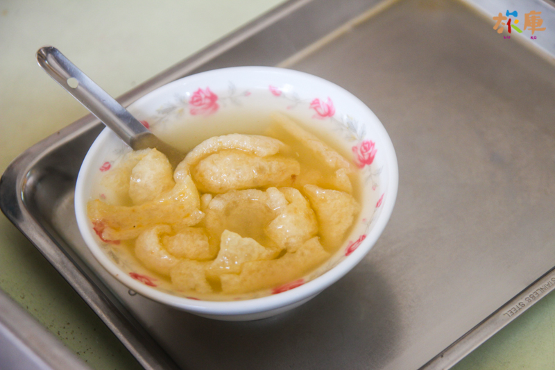 而店內還有一味肉皮湯一樣是指名度最高的湯品,豬肉皮經過由炸之後再煮爛,肉皮呈現金黃色,咬下一口有種脆彈的口感,肉皮吸收了筍子湯的滋味後,充實了酥炸肉皮的入口風味,炸肉皮彷彿有了靈魂一般令人回味。