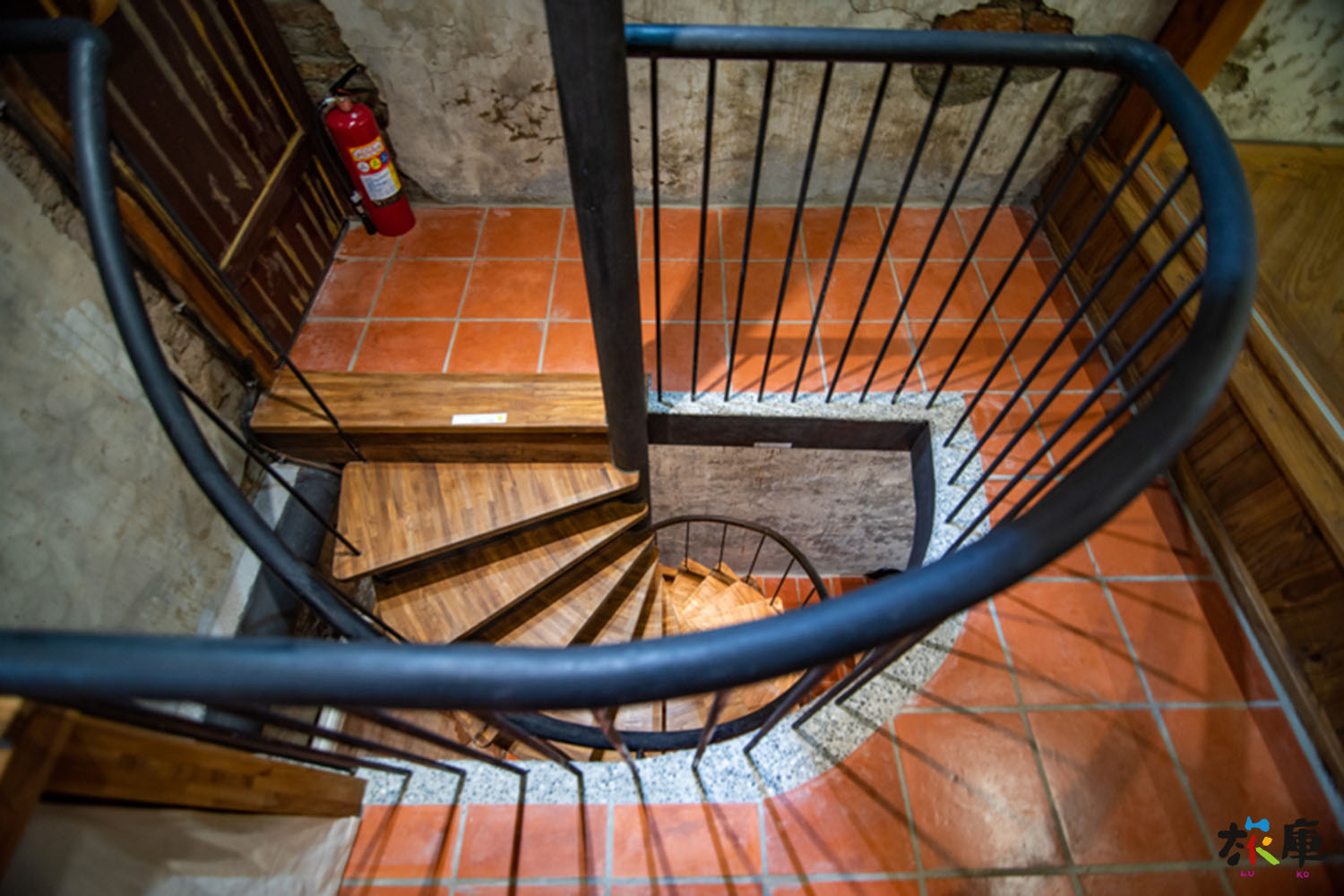 往二樓的樓梯是謙和老屋整修的一大亮點,由於百年老屋過去的樓梯皆為木作且角度非常陡,這種樓梯在現代建築其實已經不敷使用,並且作為民宿也不適合。於是設計團隊重新構思,在有限的空間裡減少坡度並增加安全性。在原有的空間底下設計出符合謙和老屋風貌的旋轉式樓梯,並透過深色鐵件與木作梯面,讓這梯子的存在幾乎不會感受到突兀。